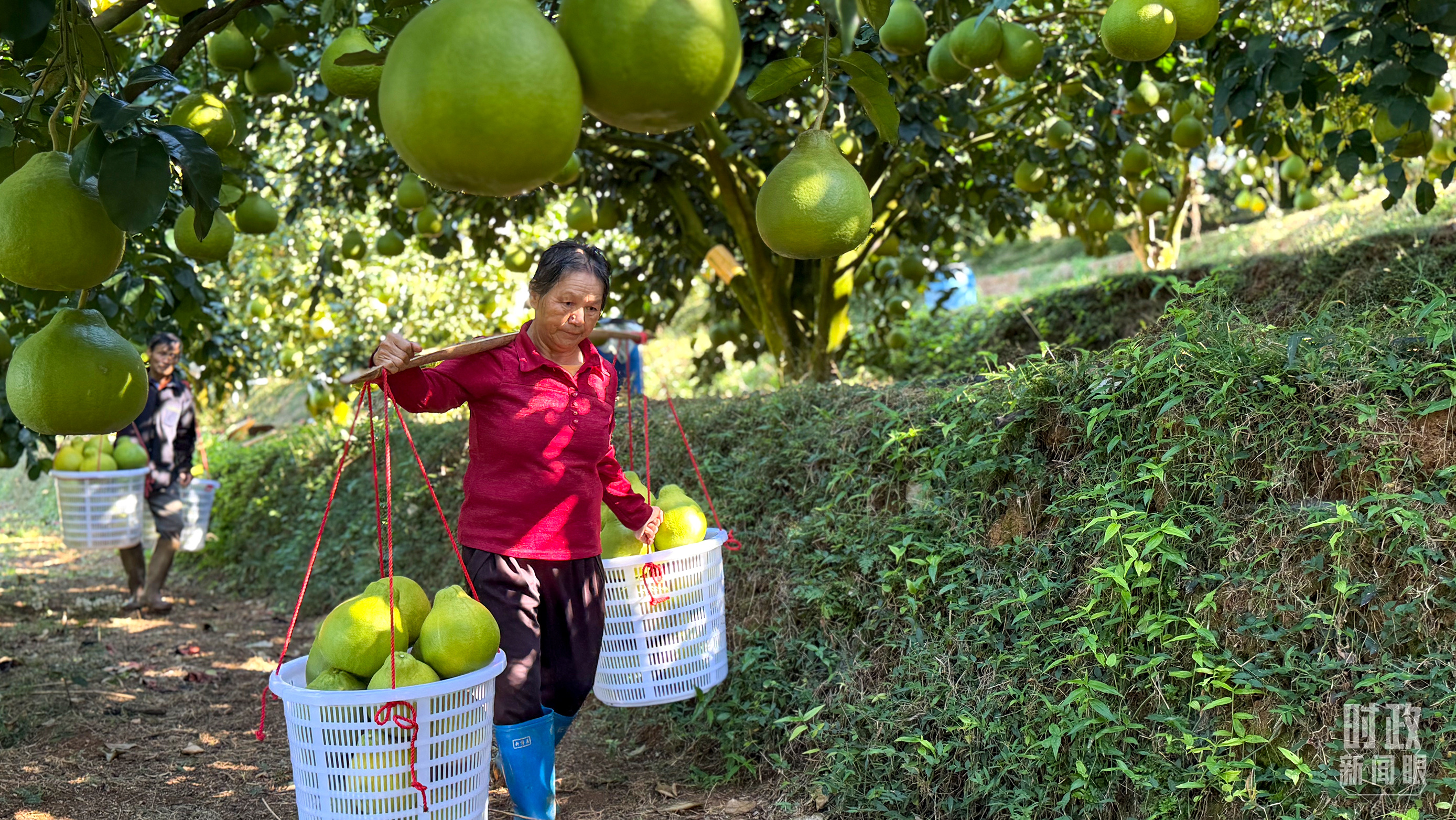 △金柚采摘運送用上了無人軌道車,可大大減輕人力負擔。(總臺央視記者郭鴻拍攝)
