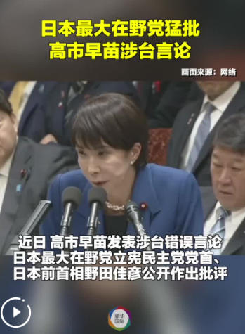 近日,日本首相高市早苗發(fā)表涉臺錯誤言論。日本最大在野黨立憲民主黨黨首、日本前首相野田佳彥和立憲民主黨政務(wù)調(diào)查會長本莊知史16日發(fā)聲,嚴(yán)厲批評高市早苗,稱其涉臺言論“越界”。(視頻:羅林嵐)
