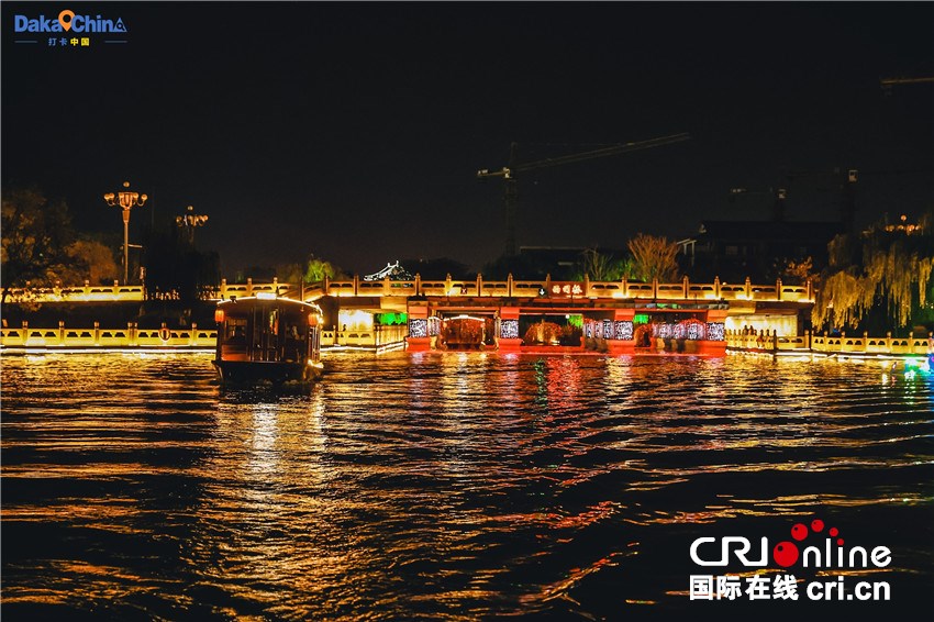 晚上的汴河兩岸,光影交織,槳聲四起。采風團乘船游覽,看古城夜景與國潮演繹完美融合,不禁連連稱奇。