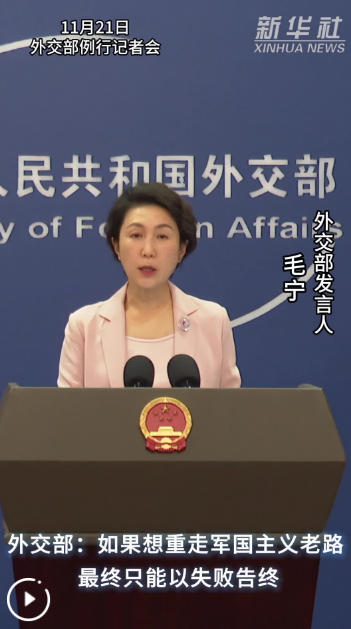 新華社北京11月21日電(記者曹嘉玥、董雪)外交部發(fā)言人毛寧11月21日表示,日本正在突破專守防衛(wèi),加緊“重新武裝”,人們不禁要問,究竟意欲何為?如果日本想重走軍國主義老路,最終只能以失敗告終。