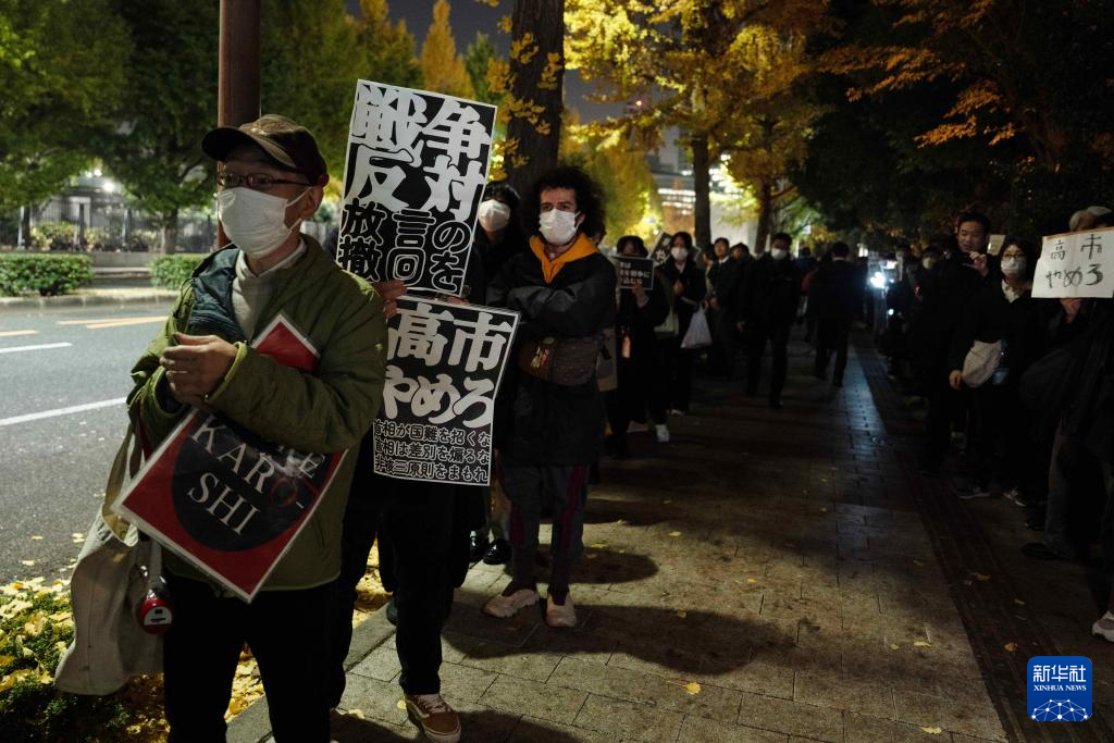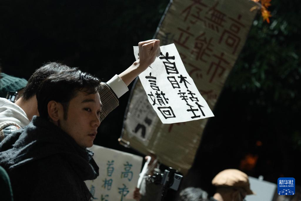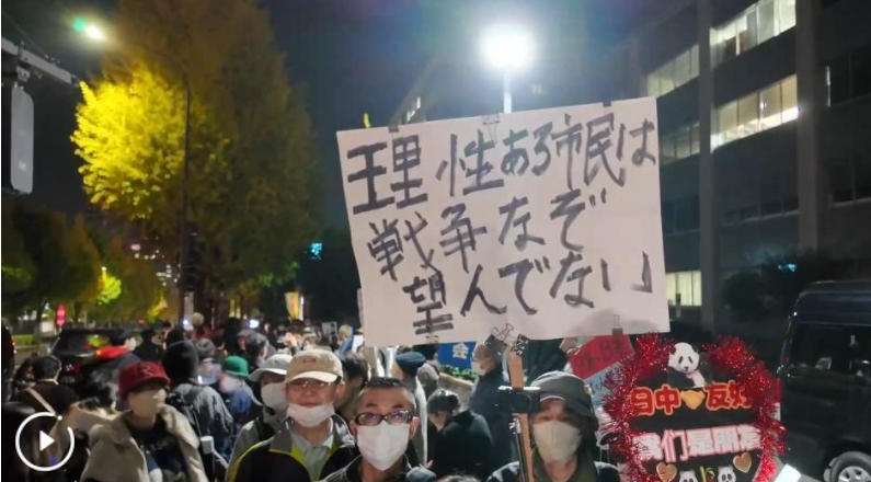 集會定于當地時間20時開始。19時前后,便有民眾陸續趕到現場。抗議者們舉著寫有“撤回言論 反對戰爭”“因高市才有事”“高市下臺”等標語的牌子,高喊“禁止軍國主義復燃”等口號。多名抗議者要求高市對其涉臺言論負責并辭去首相職務。