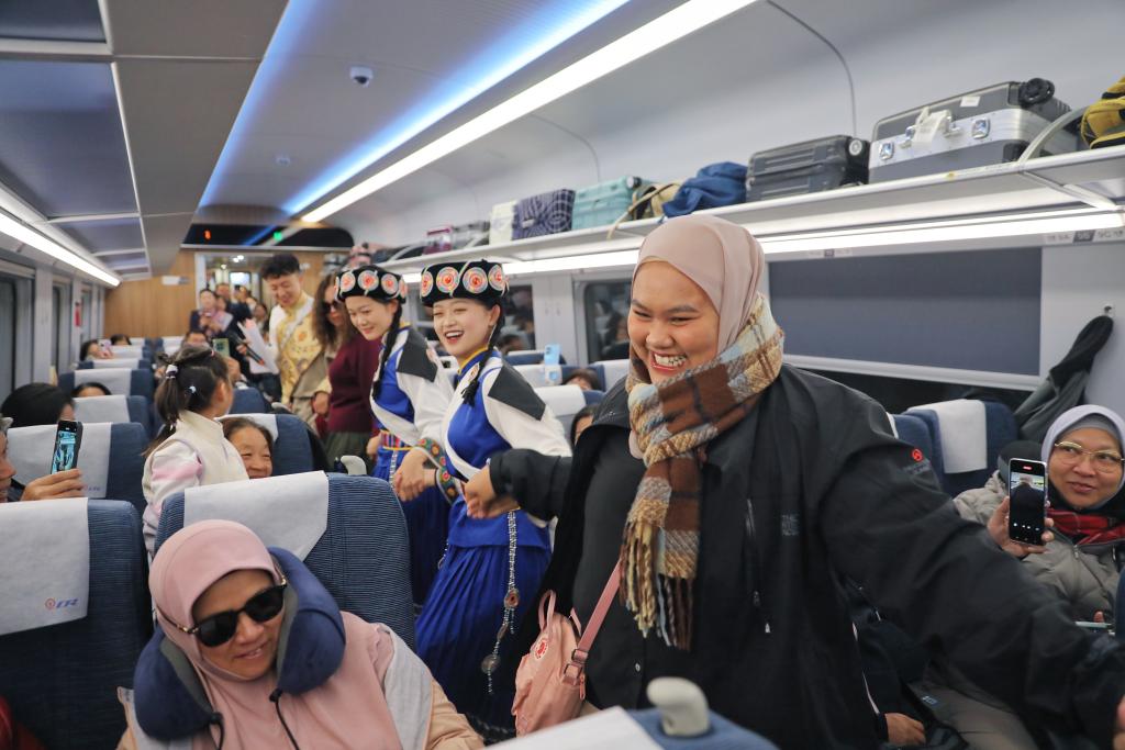 11月22日,在麗香鐵路動(dòng)車(chē)組列車(chē)上,東南亞游客與身著民族服飾的乘務(wù)員一同跳舞。新華社發(fā)(楊紫軒攝)