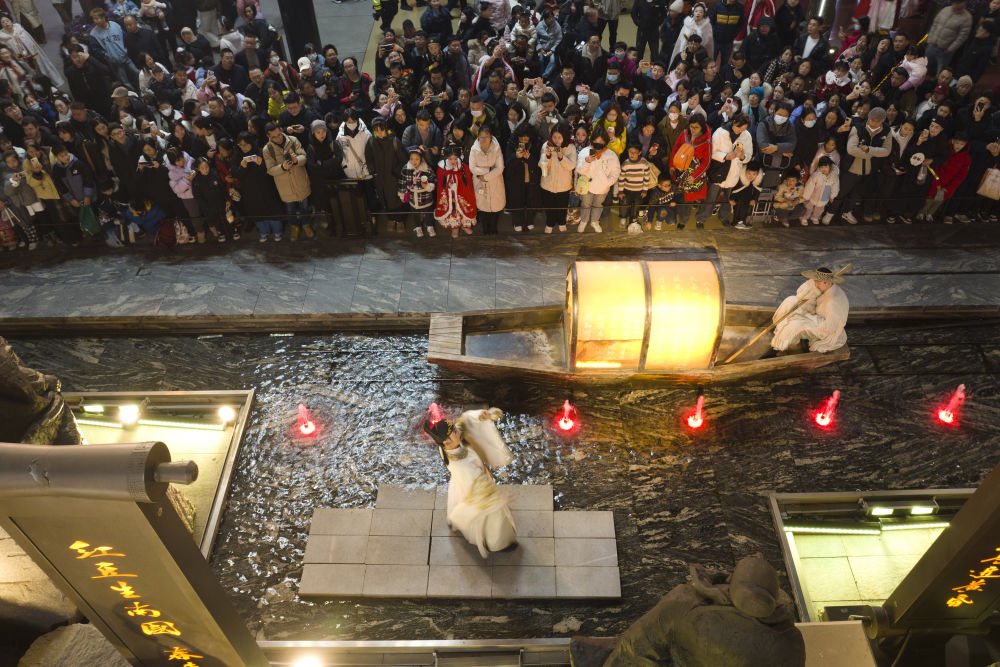 游客在西安大唐不夜城景區觀看以唐代歷史文化為背景創作的情景劇(無人機照片,2025年1月22日攝)。