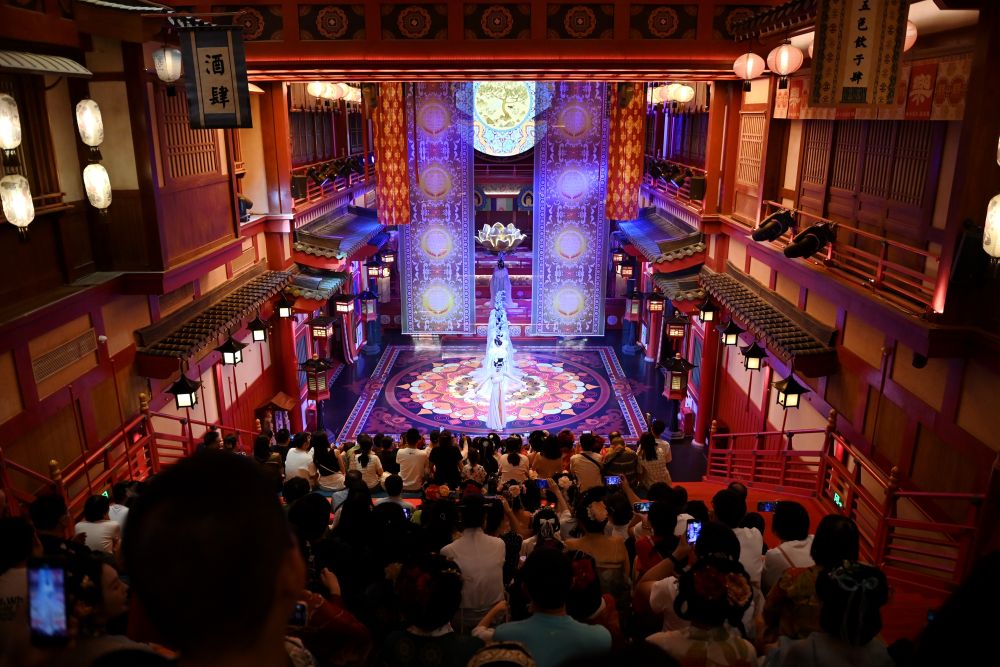 2024年5月12日,游客在西安長安十二時辰主題街區內觀看演出。街區通過漢服旅拍、演藝互動、非遺體驗等項目,讓游客“穿越”回盛唐長安,為游客打造科技感、文化味十足的游歷體驗。