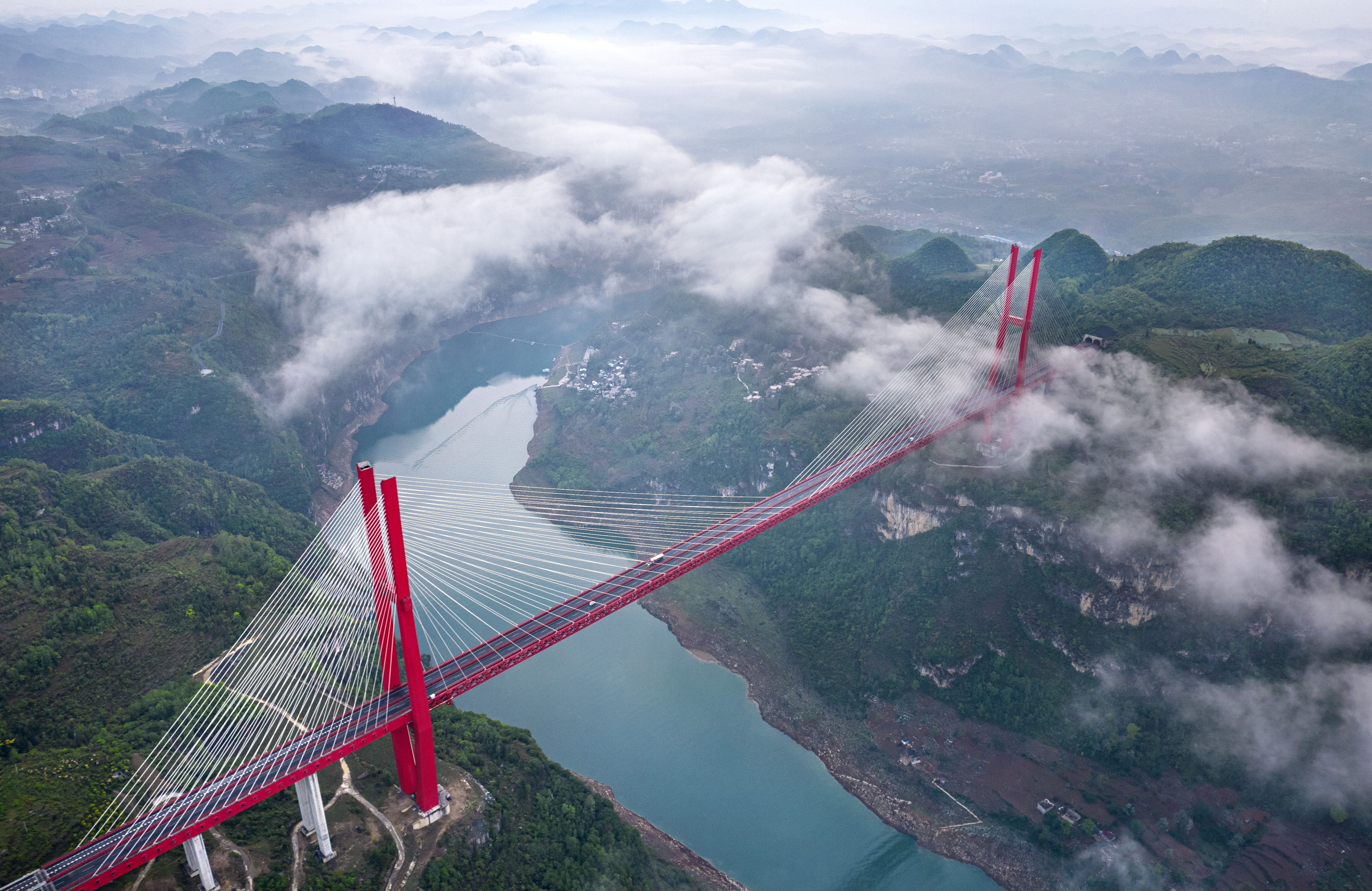 紅色大橋如長(zhǎng)虹飛架云端,疾馳的車輛穿云破霧駛向遠(yuǎn)方。