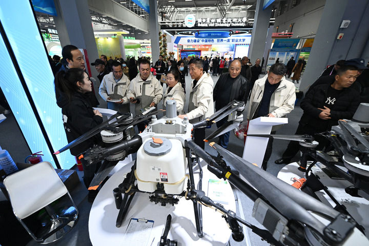 2025年10月25日,參觀者在楊凌農高會上了解大疆農業無人機。新華社記者 李一博 攝