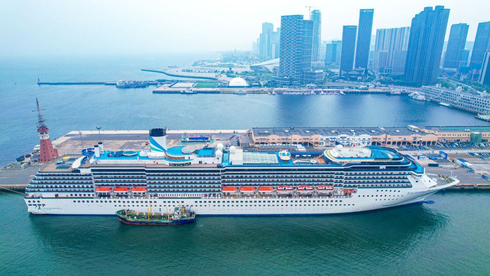 2025年5月27日拍攝的停靠在大連港國際郵輪中心泊位的“愛達·地中海”號(無人機照片)。新華社記者 潘昱龍 攝