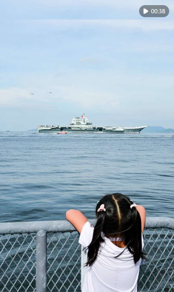 7月3日,中國海軍山東艦航母編隊抵達香港,一名兒童在岸上觀看海軍山東艦。