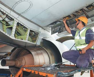 臺(tái)灣華航飛機(jī)事件后,華航昨天對(duì)同型的十二架飛機(jī)進(jìn)行檢查。圖為工程師打開(kāi)被懷疑是事故發(fā)生源頭,左上角、吊掛發(fā)動(dòng)機(jī)的派龍架。(臺(tái)灣《聯(lián)合報(bào)》圖片)