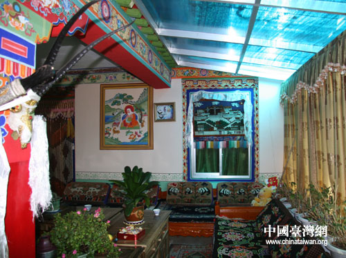 家中擺著一家人去日喀則江孜旅游時在白居寺的合影,他的兒媳婦在一旁介紹,四年前家里包了一輛中巴,去江孜旅游。女婿還指指旁邊小一點的照片說:“這是去林芝拍的,我們還去內地旅游,北京、上海都去過了。” 現在老人腿腳不好,不能經常出去了,平時只能通過看電視了解外面的事,“老人喜歡看藏語電視,聽得懂,可以知道好多事,也很高興。”
