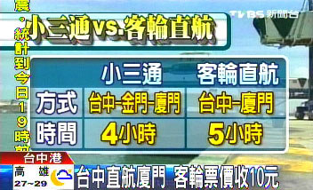 和“小三通”相比,客輪直航不用繞到金門換乘,航程相差1小時,但價格至少便宜1000元,缺點是因為目前以旅行團為主,客輪班次不多,平均6天一趟來回。華達海運公司董事長董事長焦仁和表示,“很快地,希望能夠在這個夏天,在這個旅游旺季的時候,我們取得定期航權。”