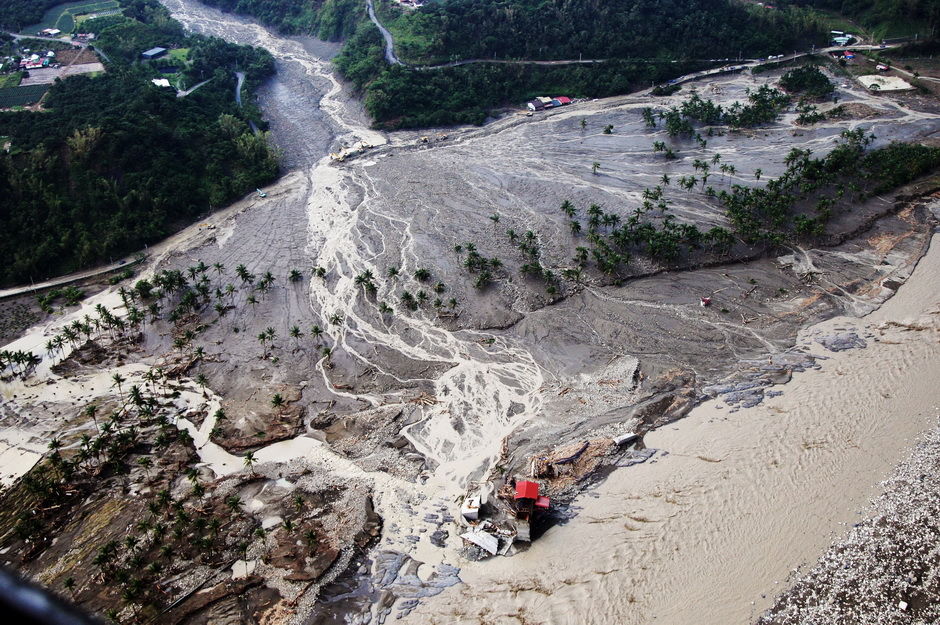 高雄縣那瑪夏鄉民族村在“莫拉克”風災中受創嚴重,一名村民看著被洪水與泥石流沖壞的房子,滿目凄涼。圖片來源:臺灣《聯合報》