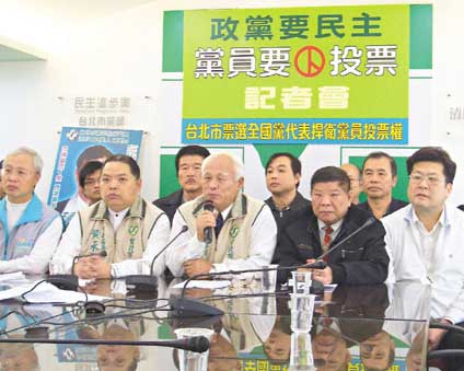 10多位民進(jìn)黨代表昨天齊聚民進(jìn)黨臺北市黨部,高呼“政黨要民主、黨員要投票”,吁民進(jìn)黨中央三思,不要漠視黨員價值。圖片來源:臺灣《聯(lián)合報》