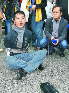 民進黨昨確定“五都”選舉排除黨員投票。會前有市議員參選人將電話線綁身上,反對只靠民調決定提名。來源:臺灣《蘋果日報》