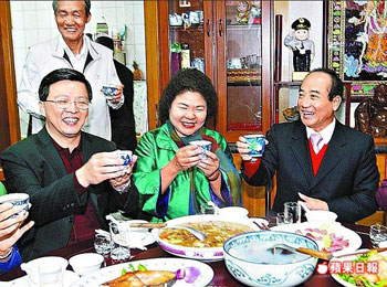 王金平春節期間都會回高雄縣路竹鄉老家,選定日期以“辦桌”方式邀請各界參加感恩餐會,昨晚在鄉內席開70桌宴請各界友人,席間有不少政壇人士,包括“立委”黃昭順、侯彩鳳、林益世等,高雄縣長楊秋興每年都會出席參加,今年也不例外,楊秋興并逐桌向與會者祝賀新年好,王金平也祝福楊秋興“心想事成”。