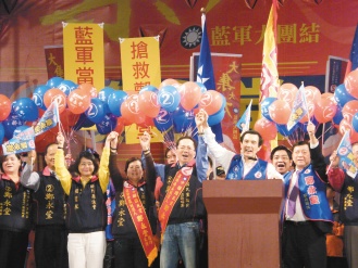國民黨主席馬英九(右三)昨晚到竹東鎮,他拉起國民黨候選人鄭永堂的手,拜托鄉親支持。 來源:臺灣《聯合報》