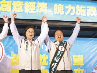 民進黨主席蔡英文(左)昨晚到竹北市為民進黨候選人彭紹瑾助選,她說:“彭紹瑾如果落選,我一定會哭。”來源:臺灣《聯合報》