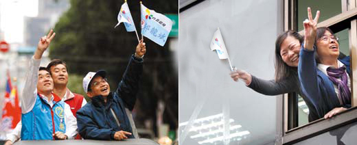 選舉倒數3天,臺北市長候選人郝龍斌昨天在中正區進行“車隊掃街”,支持者從高樓窗戶探頭出來為他加油打氣。記者陳柏亨/攝影 圖片來源:臺灣《聯合報》
