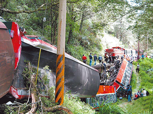 阿里山小火車昨突遭一棵斷裂的大樹砸中,4節車廂翻覆出軌,造成5死、107輕重傷慘劇。圖片來源:臺灣媒體