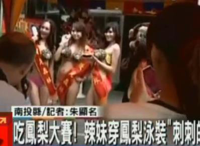 比基尼辣妹促銷鳳梨酥,將菠蘿果肉挖空之后當胸罩,并誘人舔食。圖片來源:臺灣中天電視臺
