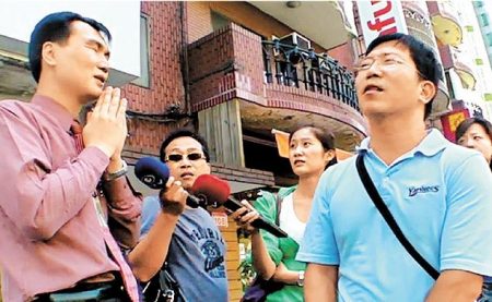 BMW洪姓車主(左)祈求李女脫險,一旁肇事司機黃云飛則懊悔不已。圖片來自網絡
