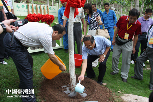 海南省臺辦副主任劉耿與臺灣新聞工作者協會理事長陳萬好共同為菩提樹施肥(中國臺灣網 趙輝 攝)