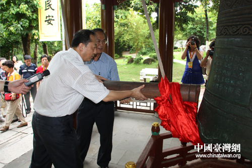 海南省臺辦副主任劉耿與臺灣新聞工作者協會理事長陳萬好共同撞響和平鐘(中國臺灣網 趙輝 攝)