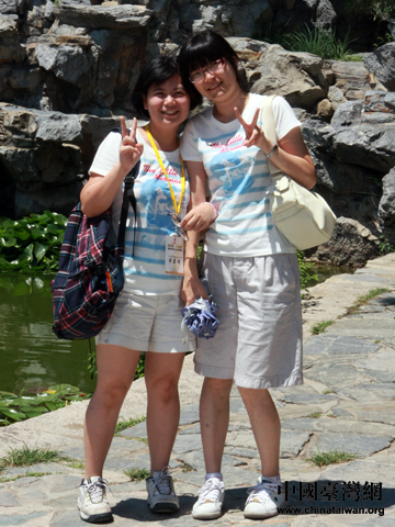 來自北京交通大學(xué)的張愛鑫和臺灣東吳大學(xué)的黃蕓羽特意身著同款衣服組成“海峽姐妹花”。(中國臺灣網(wǎng) 張維佳 攝)