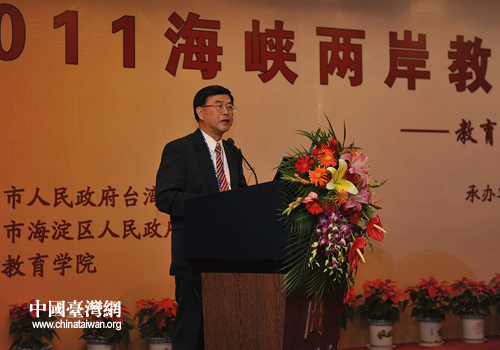 2011年海峽兩岸教育論壇在北京開(kāi)幕,前花蓮市長(zhǎng)、臺(tái)灣東華大學(xué)教授葉耀輝代表來(lái)自臺(tái)灣的100多位校長(zhǎng)和教育界人士致辭(北京市臺(tái)辦 王松 攝)