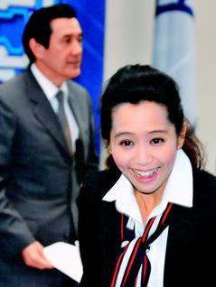 臺當局“青輔會主委”陳以真(右)28日出席國民黨中常會,馬英九(左)在會中肯定陳以真的表現,并期待她變成“小龍女”。 來源:臺灣《聯合報》