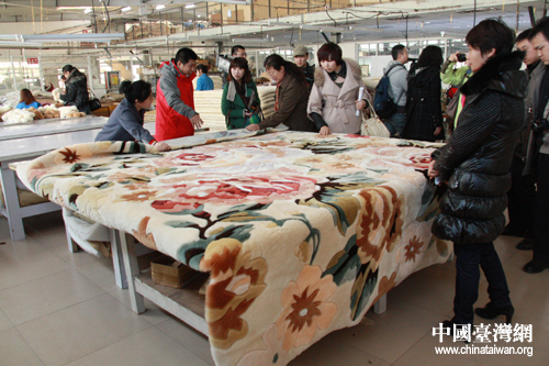 記者們對維信公司高檔精美的毛毯制品贊不絕口。(中國臺灣網(wǎng) 王怡然 攝)