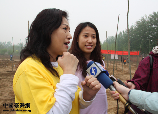 北京臺資企業協會副會長邱姿瑛攜女兒徐御格一同植樹,并接受記者采訪,暢談心得。(中國臺灣網 王思羽 攝)