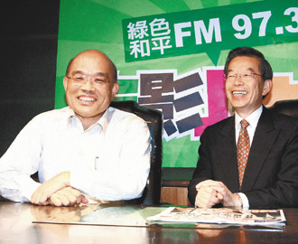 謝長廷(右)在電臺專訪蘇貞昌。(圖片來自網絡)