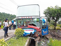 宜蘭梅花湖風景區發生重大車禍,游覽車撞上民宅圍墻(圖)造成車內37人受傷,駕駛座擋風玻璃全部碎裂,司機首當其沖,雙腿骨折受傷最嚴重。(圖片來源:臺灣《中國時報》)