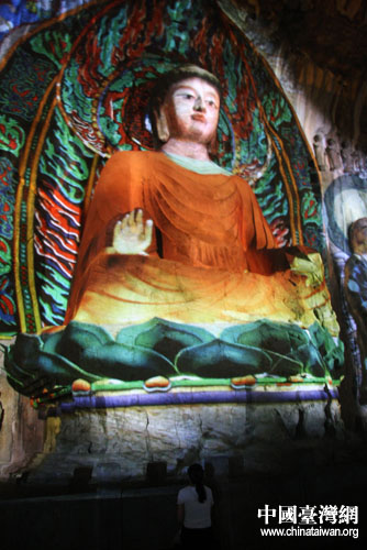 記者仰望盧舍那大像龕。(中國臺灣網 于斯文 攝)