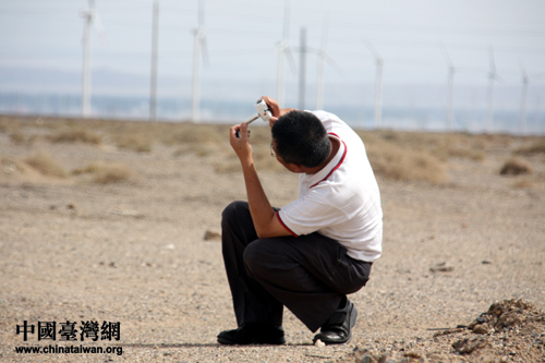 臺灣天下新聞網采訪副主任劉朝發在拍攝風電機組。(中國臺灣網 郜利敏 攝)