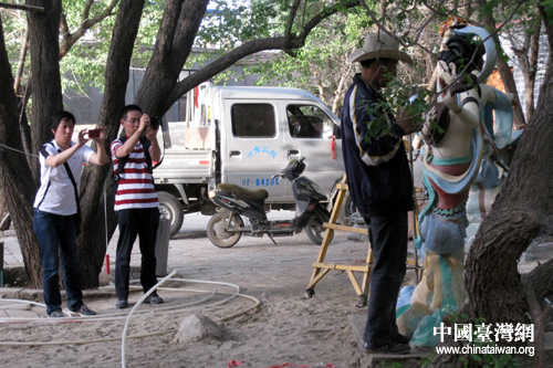 臺灣記者方勁松和藍孝威拍攝工人給飛天雕像涂色的畫面。(中國臺灣網 郜利敏 攝)