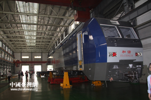 中國和平統一促進會赴湘考察團走進南車株洲電力機車有限公司的生產車間。圖為南車株洲電力機車有限公司生產的和諧號動車。(中國臺灣網 王君飛 攝)