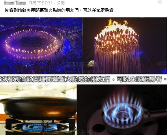 臺灣網(wǎng)友制作Kuso(惡搞)圖片:沒看到圣火點燃的朋友們,可以在家里廚房看看,只要把瓦斯?fàn)t火打開就很像了。 圖片來源于網(wǎng)絡(luò)