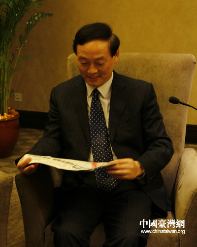 農(nóng)業(yè)部副部長(zhǎng)余欣榮會(huì)仔細(xì)閱讀嘉義市農(nóng)會(huì)總干事蕭淑麗帶來的島內(nèi)宣傳資料。(中國(guó)臺(tái)灣網(wǎng) 郭瑩瑩 攝)