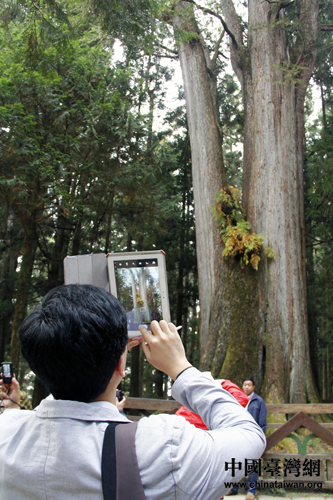 參訪團(tuán)成員在阿里山香林神木前拍照留念。(中國(guó)臺(tái)灣網(wǎng) 于斯文 攝)