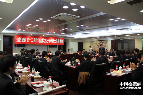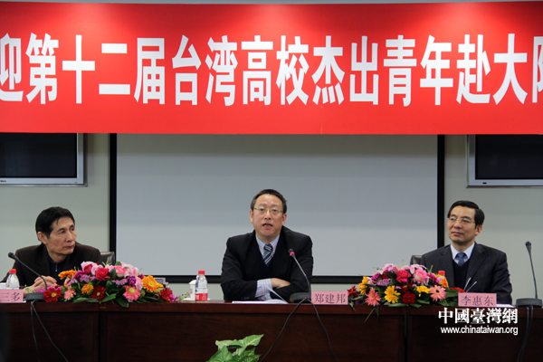 全國(guó)政協(xié)常委、民革中央副主席、中華中山文化交流協(xié)會(huì)副會(huì)長(zhǎng)鄭建邦在北京會(huì)見(jiàn)了“第十二屆臺(tái)灣高校杰出青年赴大陸參訪團(tuán)”一行,并與“杰青團(tuán)”就兩岸之間的交流問(wèn)題展開(kāi)座談。(中國(guó)臺(tái)灣網(wǎng) 芮益芳 攝)