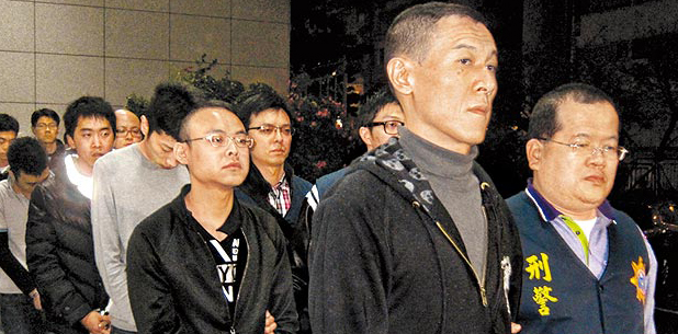 警方逮捕案件主嫌竹聯(lián)幫風(fēng)堂堂主張國強(qiáng)(右二)等8人,昨訊后移送臺(tái)北地檢署。(圖片來自臺(tái)媒)