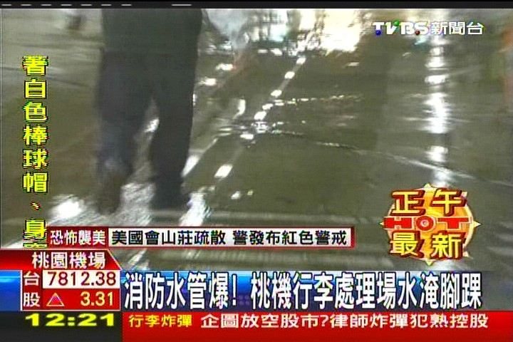 據臺灣TVBS電視臺報道,清晨4點,桃園機場第一航廈地下室的行李處理場滿是積水。機場人員發現后緊急關掉制水閥開關,清理現場,并緊急以大片塑料布覆蓋行李輸送機具,以防受潮。所幸當時沒有旅客,否則行李恐怕都將泡在水中。