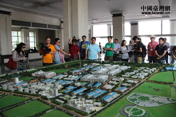 兩岸記者參觀西安綜合保銳區沙盤。(中國臺灣網 王文英 攝)