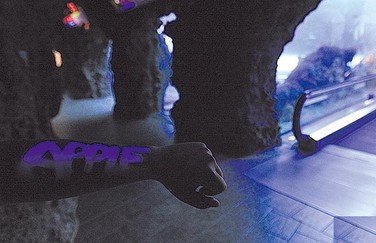 記者也用同產(chǎn)品在手臂涂“APPLE”字樣,紫光燈下果然現(xiàn)形。(圖片來自臺媒)