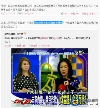 據臺灣東森新聞云報道,周玉蔻與小S先前因黑人潮T事件隔空對杠,結下梁子。周除了在節目上建議小S暫時退出演藝圈,還呼吁大陸“應該把她的節目禁了!”此番發言讓網友疑惑:“她到底對小S是有多少不滿?”涌入上千人在周的微博留言。周玉蔻也不是省油的燈,直說“這些來我家打滾罵人的,怎么那么沒有創意呢?別窮忙了,也氣不到我,傷不到我,回家多讀幾本書吧!”