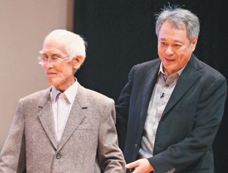 李安(右)與余光中(左)對談《我與電影》。李安貼心扶著余光中出場。(圖片來源:臺灣聯合新聞網)