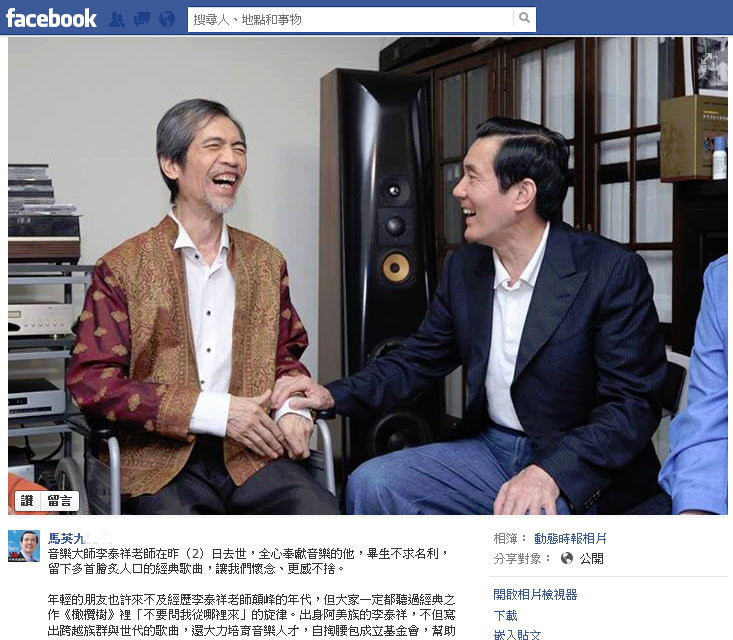 馬英九在臉書懷念音樂大師李泰祥。(馬英九臉書截圖,來自臺媒)