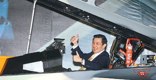 馬英九昨天上午前往臺南空軍基地,參加空軍司令部舉行第四四三聯隊“翔展項目接裝典禮”。圖片來源:臺灣《聯合報》